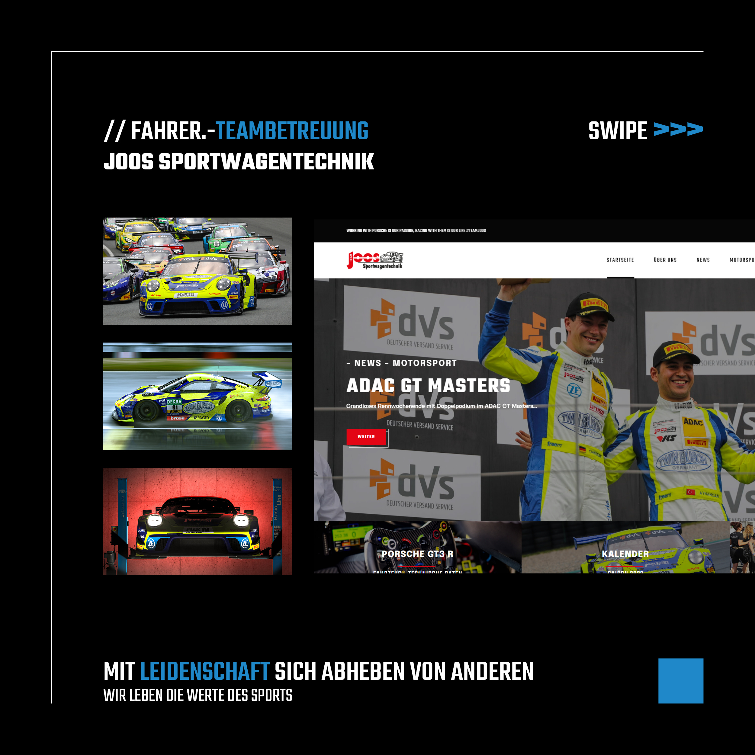 Joos Sportwagentechnik steht seit vielen Jahren für höchste Kompetenz rund um Fahrzeuge der Marke Porsche – von technischer Betreuung und Service bis hin zum professionellen Motorsport-Einsatz. Motorsport ist nicht nur Teil des Leistungsportfolios, sondern gelebte Leidenschaft: Unter dem Hashtag „WORKING WITH PORSCHE IS OUR PASSION, RACING WITH THEM IS OUR LIFE“ präsentiert sich Team Joos auf nationalen und internationalen Rennstrecken.